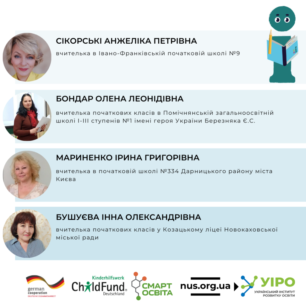 Отже, про свій досвід говорять: вчителька початкових класів в Івано-Франківській початковій школі №9 Анжеліка Сікорські, вчителька початкових класів у Помічнянській загальноосвітній школі І-ІІІ ступенів імені героя України Євгена Степановича Березняка Олена Бондар, вчителька у початковій школі №334 Дарницького району міста Києва Ірина Мариненко та вчителька початкових класів у Козацькому ліцеї Новокаховської міської ради Інна Бушуєва.